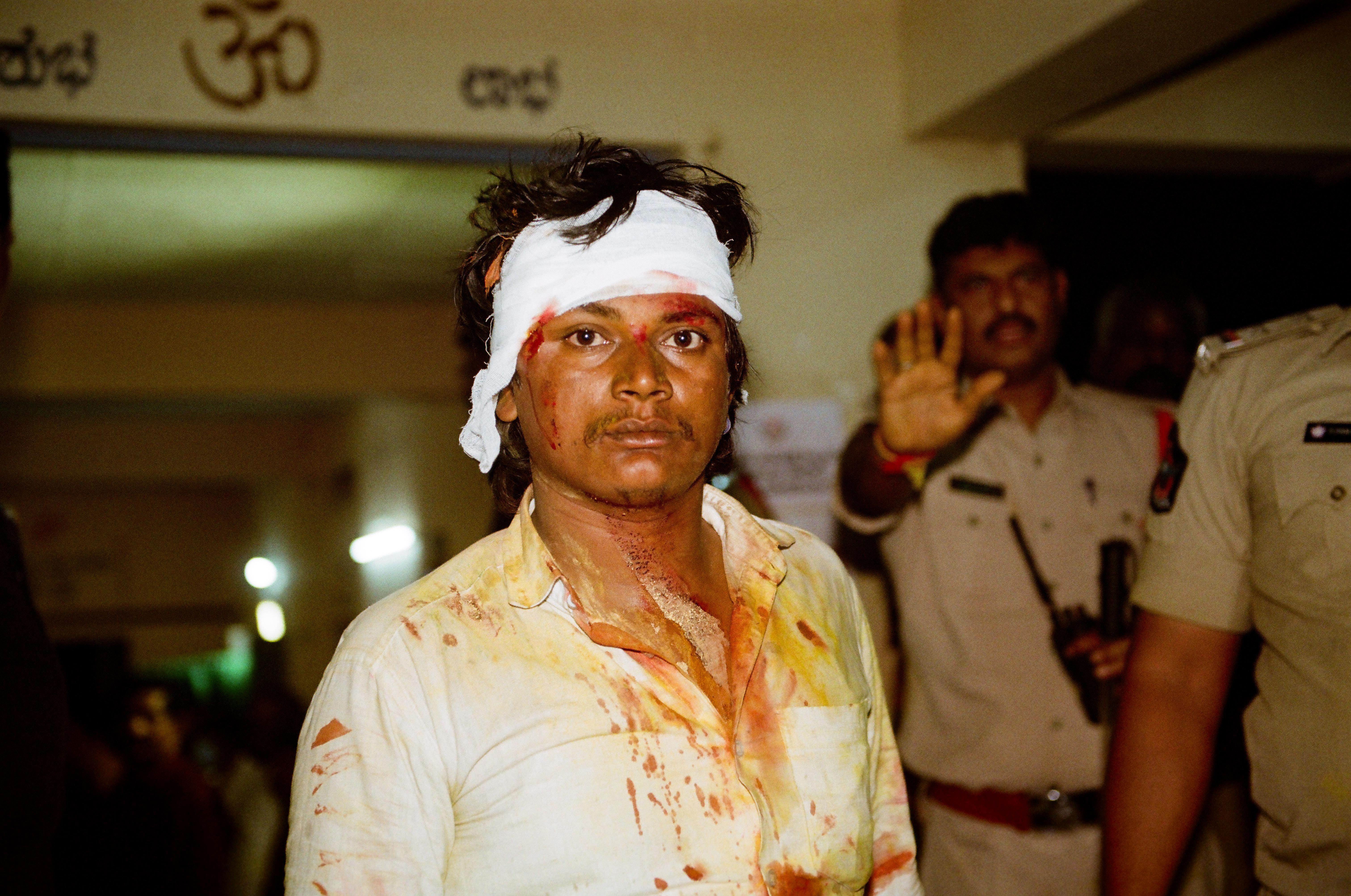 A villager moments after getting hit on the head during the Banni Festival, where 350,000 fight with metal-ringed sticks